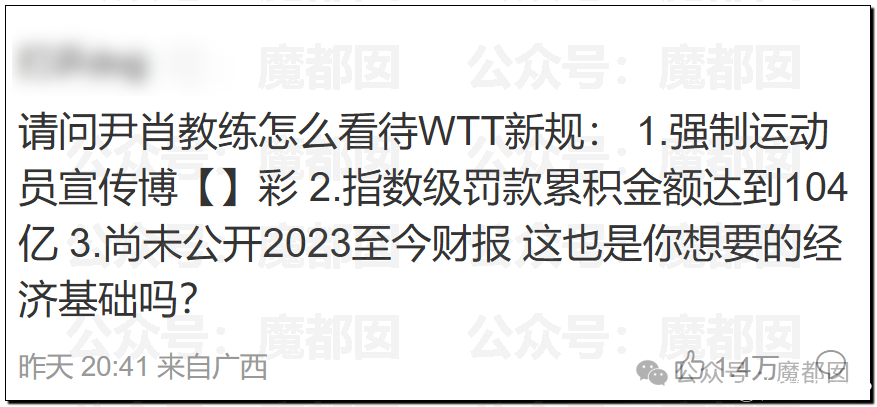 1、直接喷吴敬平,说他胡说八道。根本没有逼退的说法。 具体的真相我们不知道,但是显然,从站队来说,尹肖是站在了国乒这边。 2、全力维护国际乒联。全力维护WTT,为WTT开脱,没有正面回答为何在规则下樊振东、陈梦这种选手都不给排名的问题。