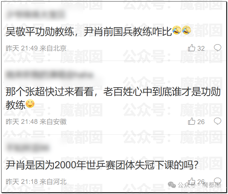 相当明显……把吴老称为“功勋教练”,尹肖称呼为“前国乒教练”,这个差距不小啊……要知道,张超教练之前曾经站过队,把尹肖称呼为功勋教练。
