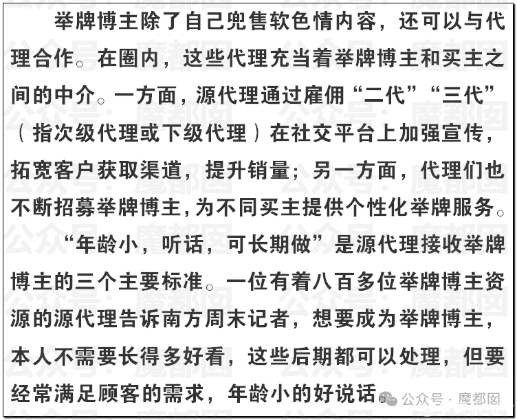 圈内不仅聚集了未成年女性,也包含了不少未成年男性。在某社交平台上,搜索关键词“举牌”,有1400多万帖子,129万关注者。其交易链条主要由三个群体组成:举牌博主,按照买主需求拍摄;代理,宣发、售卖X照片、视频;买主,进行“软X”消费。