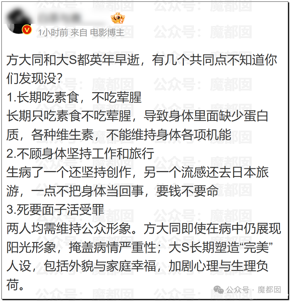 很多网友想起来大S也是长期吃素,身体素质根本扛不住突发而来的疾病,很多大V直接开喷了: